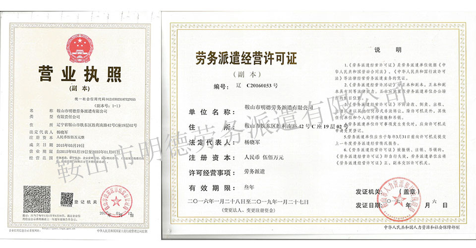 鞍山市明德勞務派遣有限公司于2013年由鞍山市工商局,鞍山市人力資源與社會保障局核準成立,實繳注冊資金500萬元。